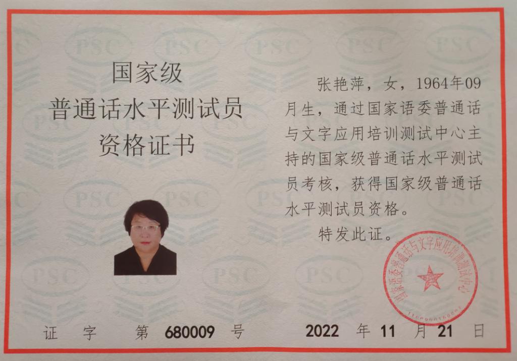 best365中国官方网站张艳萍老师获得国家级普通话测试员资格证书 张艳萍老师是河北省普通话测试员,她不断进取,努力提高自己的普通话水平,积极参加普通话测试及推广活动。2022年经唐山市语委推荐,参加了国家语委组织的国家级普通话测试员培训。疫情期间,克服重重困难,完成了两期88学时的学习并通过严格考试,顺利通过了国家级普通话水平考试和国家级普通话测试员资格考试。因疫情原因,国家语委于今年暑假期间颁发证书。